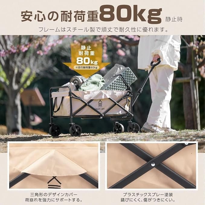 【仕様】 製品名:アウトドア キャリーワゴン 型番:sl-lc120-bk 材質:ポリエステル(オックス織りシート)、スチール(フレーム)、PP+PVC(タイヤ) サイズ:使用時 約W70 D50 H65.5~92cm 収納時 約W50 D13 H66cm カラー:ブラック。 重量:約5.2kg 容量:約58L 同梱品:本体 1、取扱説明書 1