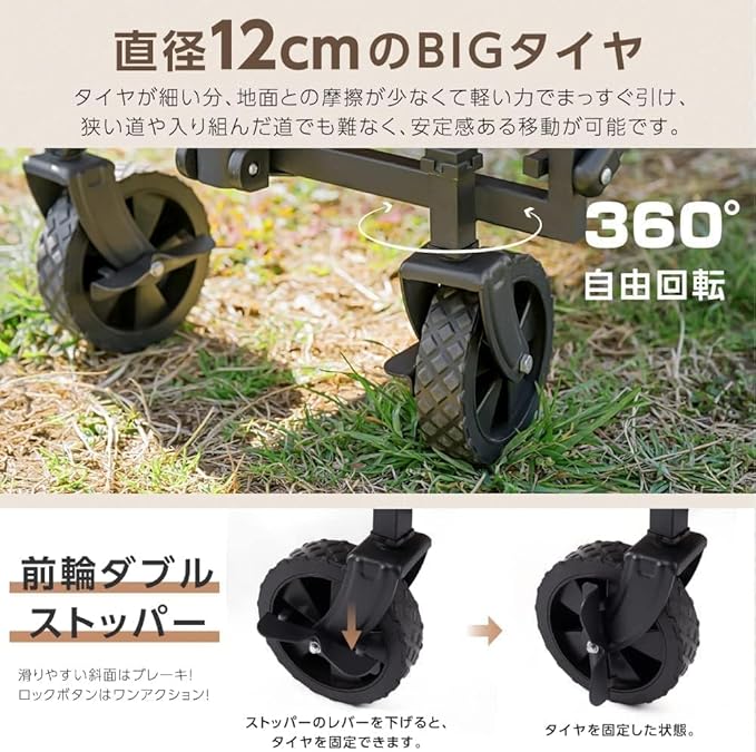 【前輪360 回転キャスター式/ O字型ハンドル】四輪は直径12cm 幅3cmのタイヤ。前輪360 回転キャスター式で小回りが利きます。タイヤが細い分、地面との摩擦が少なくて軽い力でまっすぐ引け、狭い道や入り組んだ道でも難なく移動可能です。O字型ハンドルは指全体を包んで自然に握れて、65.5cmから最大92cmまで自由に調整して、運びやすい高さを選べます。また、脱着できて前後の角度が自由となり、楽な力で引きやすい構造です。