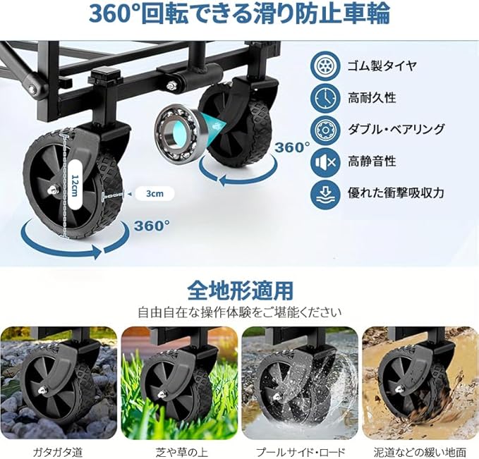 【滑り防止タイヤ】 このキャリーワゴンは、ベアリング内蔵のタイヤを搭載しており、静かで安定した走行が可能です。平坦な場所はもちろん、砂浜や砂利道、芝生などの凹凸のある道でもスムーズに移動できます。