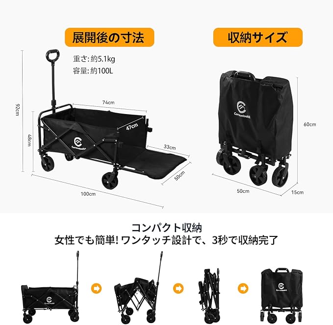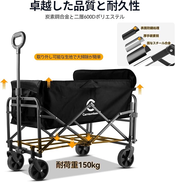 【耐久性抜群&省スペース収納】 折りたたみ キャリーカート フレームには強度の高いカーボンスチールを、布地には耐摩耗性に優れた600Dオックス布を使用。折りたたみ後は49 13 63cmのコンパクトサイズで、自宅や車載にも便利。専用の防塵収納バッグ付き、使わない時もホコリや汚れからしっかり守り、次回のアウトドアに備えられます。