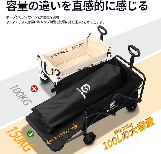 【100L大容量&150KG耐荷重で装備一式を一気に運搬】 大容量設計により、テント、チェア、寝袋、調理器具などのファミリーキャンプ用品をまとめて運べる。アウトドアワゴン 従来の手持ちバッグの約4倍の荷物が一度に運べるため、往復の手間を大幅削減。伸縮性のあるカーゴネットを付属。併用することで荷物をよりしっかり固定できます。キャンプ初心者にもおすすめ。
