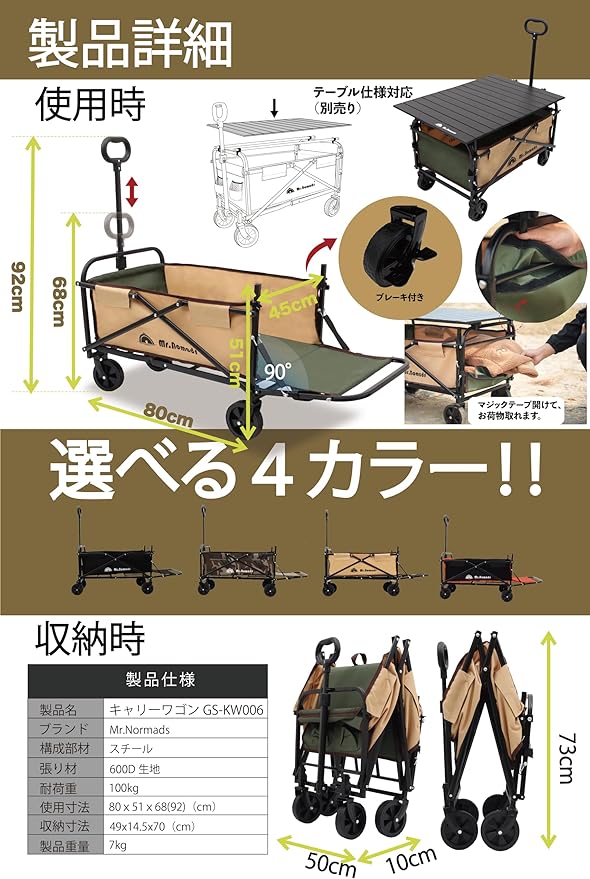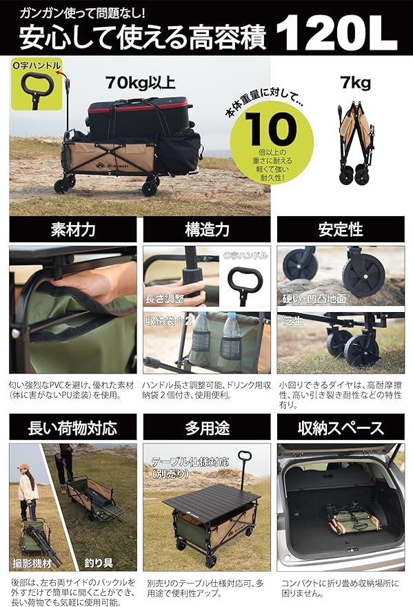 ✅【補足説明】 ①「本製品以上の耐荷重・積載容量」や「砂浜で利用できるワゴン」をお求めのお客様は、.の KW001〜 KW004番の商品がおすすめです。 ②後部を開くことができる商品タイプ(商品番号:KW006)について:荷物が落ちないように、ベルトの長さを短く調整しています。不良ではないことをご了承ください。