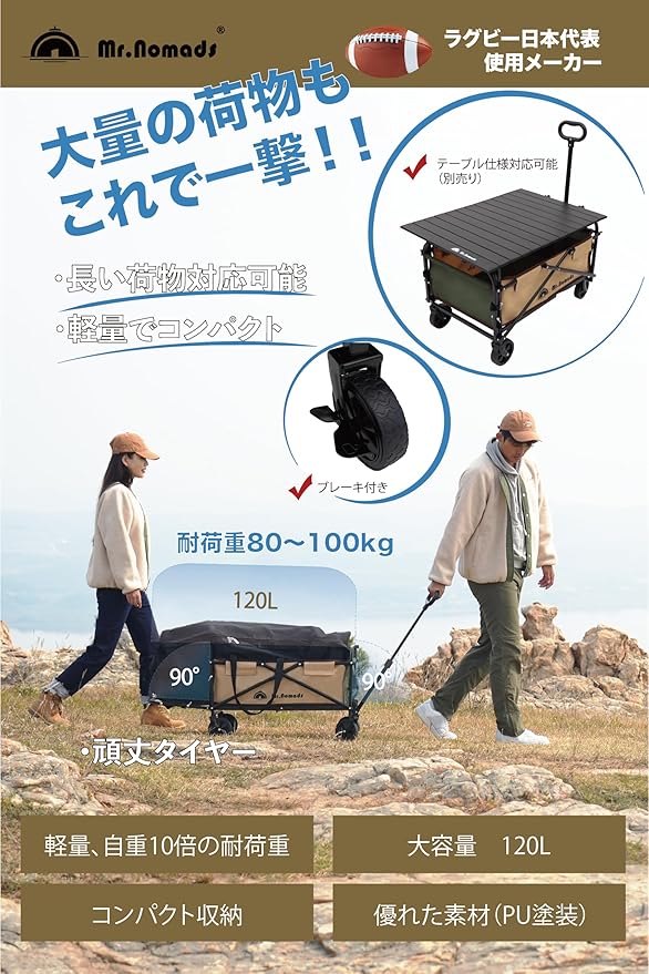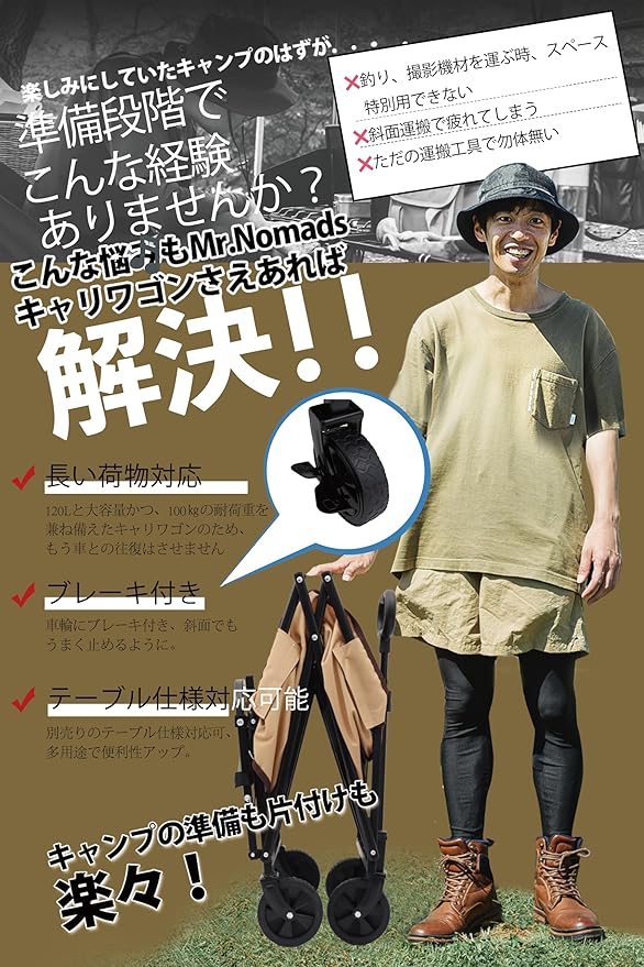 ✅【大量の荷物も一度で運べる】 Mr.Nomadsがこだわった強度の高いフレームが可能にする驚きの大容量130L可能 & 耐荷重100kg!キャリーワゴンを使えば、アウトドアやキャンプ場などの悪路でも大量の荷物を一度にラクラクと運べるので疲れません。また、ゴムバンドが付属しているので、大量の荷物もしっかり固定できます。 ※荷物を移動させる際は表示耐荷重に対して80%ほどの重量で使用することを推奨しております。