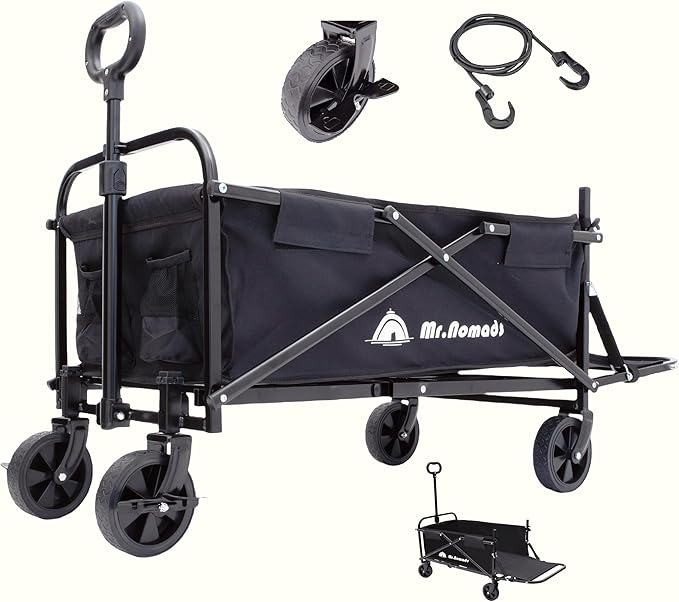 MR. NOMADS 【ラグビー日本代表使用メーカー】 キャリーワゴン キャリーカート 【ブレーキ付】 軽量 大容量 130L可能 耐荷重100kg 長い荷物対応 コンパクト ワンタッチ収納 高耐久 4輪 こども乗せれる 折り畳み アウトドアワゴン キャンプワゴン カート 子供 ペット散歩 釣り 撮影 (KW006 BlackBlack) リアゲート付き | oioioichan