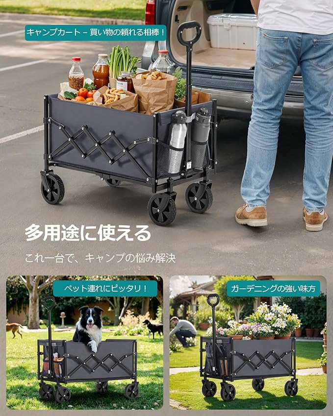 【様々なシーンで活躍】ガーデニング作業はもちろん、食料品等の運搬、ピクニックやキャンプでのお菓子 食器運びまで。このキャリーワゴンがあれば、あらゆる場面で大活躍します。