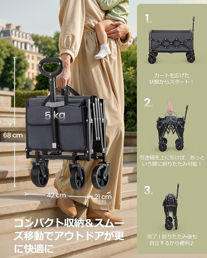 【折りたたみ式で省スペース】引きひもを引くだけで簡単に折りたためるキャリーワゴン。折りたたみ時サイズは約42cm(幅) 21cm(奥行き) 68cm(高さ)とコンパクトで、車のトランクや狭いスペースの収納に最適です。