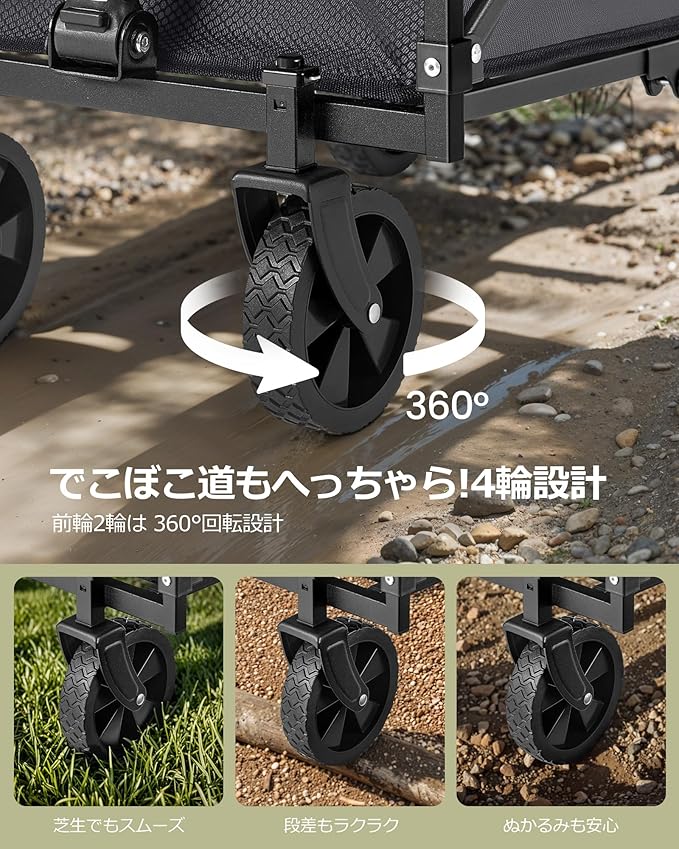 【自在な動き&ホイール交換可能】全4輪 (うち2輪は360 回転) で小回り抜群! ブラックデザインの牽引タイプワゴンは、キャンプ場でもガーデンでも楽々移動。ホイールは簡単に脱着 交換できるので、メンテナンスもラクラクです。