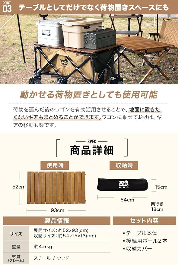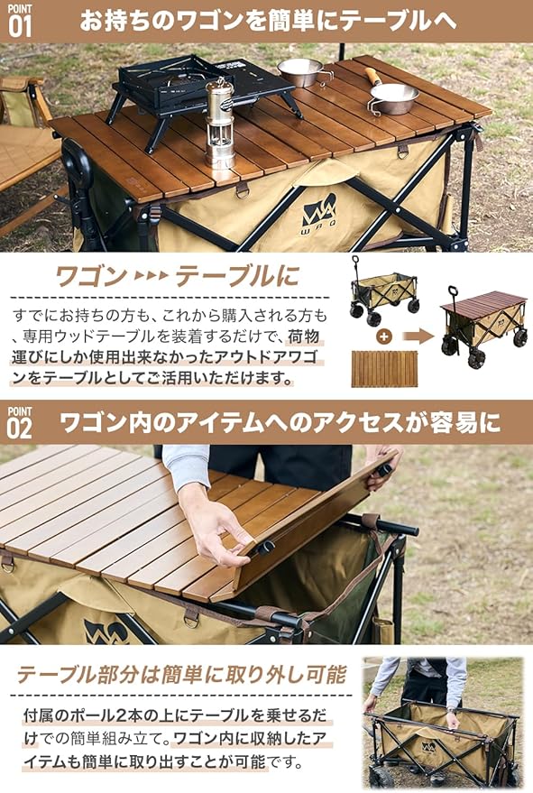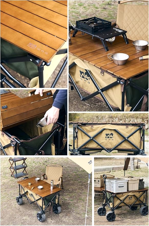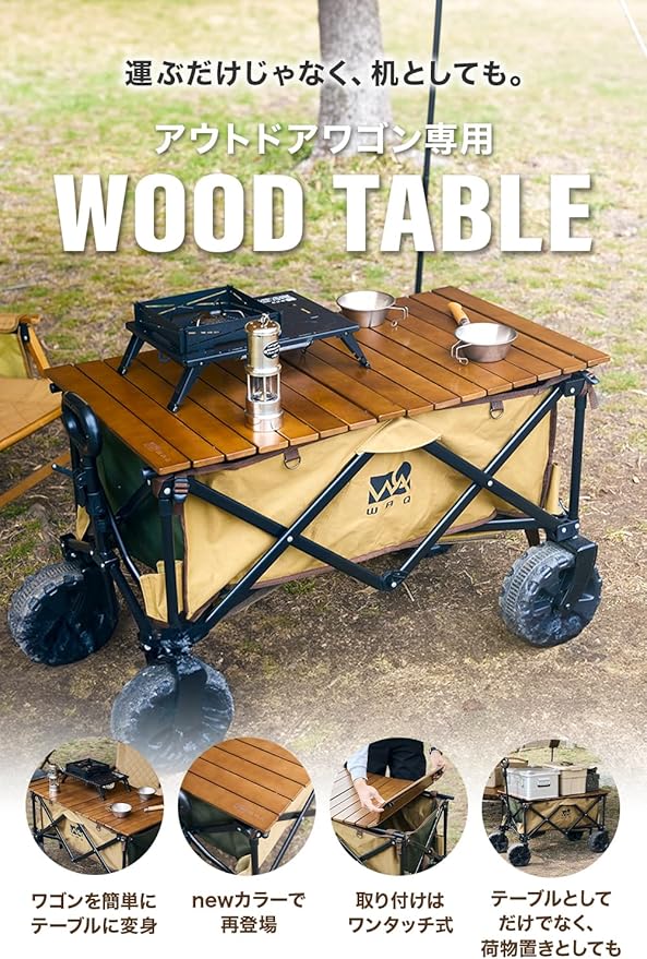 WAQ キャリーワゴン【 大型タイヤ 】自立収納 コンパクト 耐荷重150kg ワンタッチ収束式 106L 大容量 折り畳み アウトドアワゴン キャリーカート マルチキャリー 軽量 4輪 特大 タイヤ キャンプ WAQ OUTDOOR WAGON (専用アルミテーブル) (ウッド) (ワゴン専用アルミテーブル(BLACK)) | oioioichan
