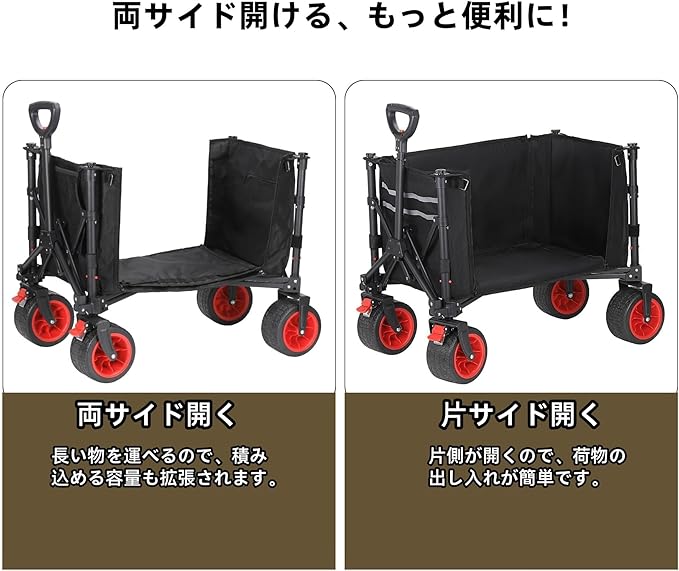 【長い物も運べる機能性/伸縮可能のハンドル】キャンプカー両側のジッパーを開ければ、長尺の荷物も楽々運搬可能!サイズ制限がないため、作業効率がぐんとアップします。さらに、90度調整可能なハンドルは上下自由自在に動かせ、高さも55~96cmまで調節可能。