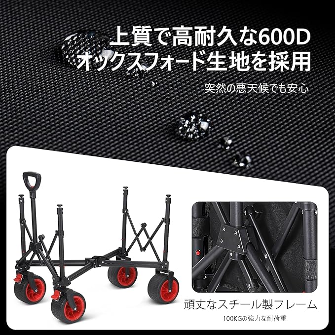 【上質なオックス採用/頑丈なフレーム】アウトドアワゴンは高品質な600Dオックス生地を使用しており、お手入れが簡単で酸化防止加工が施された表面は、長期間ビーチなどで使用しても色褪せしません。最大100kgの重量をしっかりと支えます。炭素鋼フレームを採用し、耐摩耗性に優れ、安定性抜群の高耐久設計を実現しました。