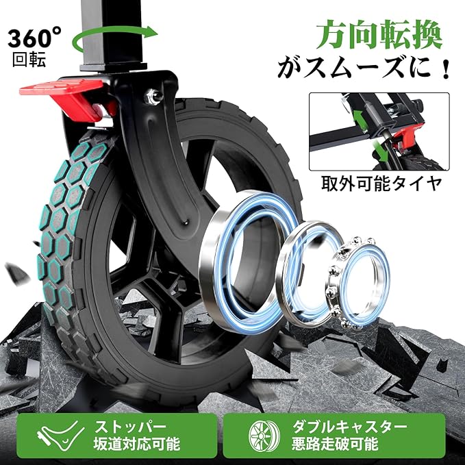 【ブレーキ付・取外可能タイヤ】❶アウトドアワゴンのタイヤがダブルキャスターを装備し、直進性に優れ、O字型のハンドルが指にフィットし、方向転換も楽に行える。❷高耐摩耗性、高い引裂き耐性のポリウレタン素材を採用し、ブレーキも搭載し、坂道、芝生や凸凹道、ぬかるみ、舗装路、砂利道、砂浜などでも安定して進めます。