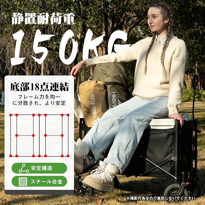 【150L大容量・150Kg高耐荷】❶Hikentureキャリーワゴンは錆び止めスチール合金と底部18点連結のフレーム構造で力を均一に分散され、安定性を一層高め、耐荷重上限まで重りを載せた場合でも、重さをそれほど感じることなく円滑に移動できます。❷積み重ねれば270Lの容量に達して、.のアウトドアワゴンを使って 家族分のキャンプ用品でも一度にたくさんの荷物を運べるので、車とサイトの間を往復する手間が減ります。