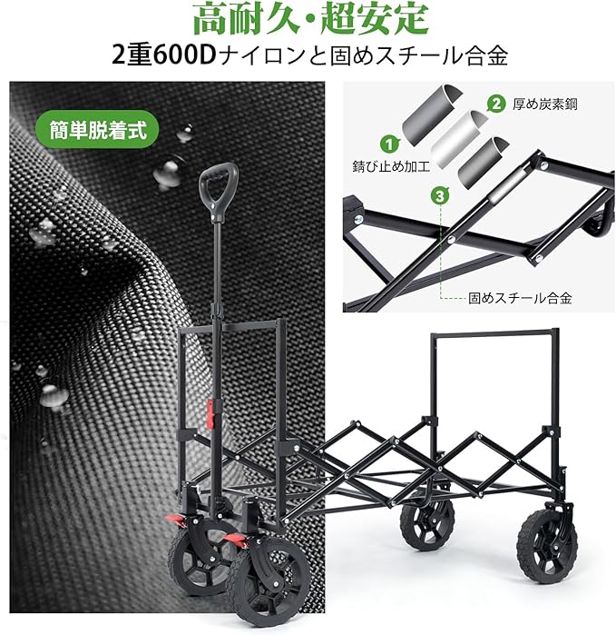 【2重600Dナイロン・引裂防止・防撥水】❶Hikentureキャリーワゴンの生地は業界初2重600Dナイロン素材を採用し、従来品より2倍耐久性があり、長く愛用できます。❷生地の裏面に防水材を塗装し、悪天後でも濡れタオルで簡単に汚れを拭き取ることができます。