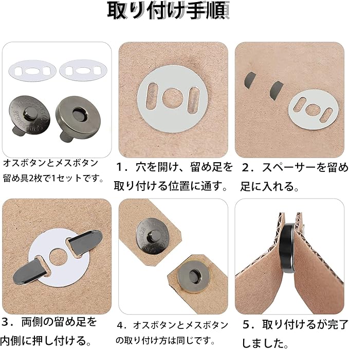 磁気クラスプには 1つのオスバックル、1つのメスバックル、2つのワッシャーから成り立っています。取り付けが終われば、組み立てが容易になる。