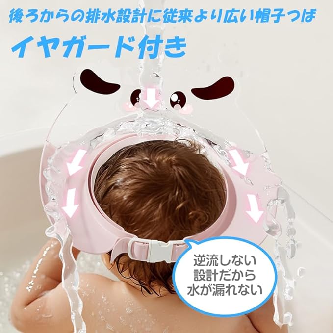 【逆流防止設計】軌道式院ナーリング設計で、後ろから排水できるようになり、イヤガード付きで、目や耳にの水がかからず、タイムを快適にします。