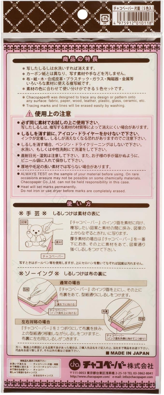 青・赤・白・黄・緑の5色が入ったエコノミーモデル。素材の地色に合わせて色の使い分けができます。図案写しや、ソーイングのしるし付けに。