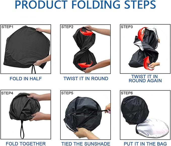 【折りたたみ式収納】:フロントガラスカバーサンシェードはひねって折りたたむことができるので、収納したいときは折りたたんで付属の収納バッグに入れるだけで、車のドアや客室に簡単に収納できます。