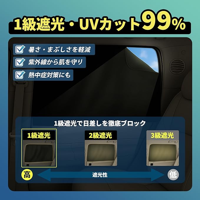 ★【完全遮光・UVカット99%】 強力な遮光性能で日差しをしっかりカットし、車内の温度上昇を防ぎます。まぶしさを抑えることで、ナビやスマートフォンなどの電子機器の画面も見やすくなり、快適なドライブ環境を実現。 また、UVカット率99%の高性能素材が、肌への紫外線ダメージを抑え、内装の日焼けや劣化を防止。特に、小さなお子様やペットが乗車する際の熱中症対策としても効果的です。