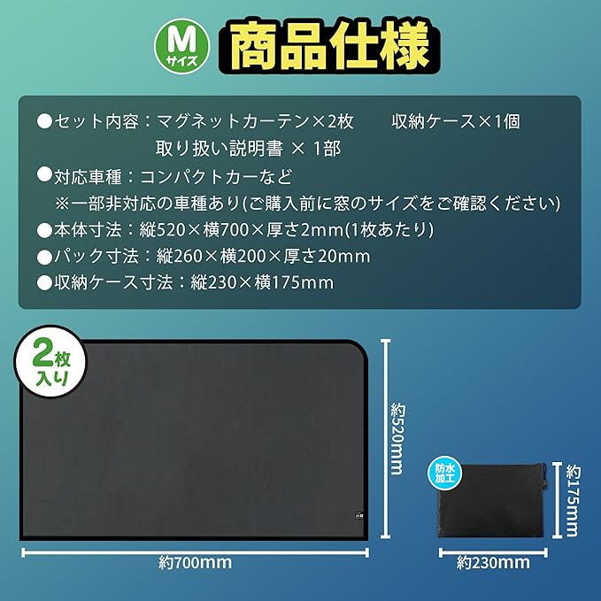 ★【商品仕様】 ●セット内容:マグネットカーテン2枚入り、収納ケース付き ●対応車種(Мサイズ):コンパクトカーなど※一部非対応の車種あり ●本体寸法(Мサイズ/1枚あたり):縦520 横700 厚さ2mm ※実際の本品は長さに 1cm誤差が生じる場合がございます。予めご了承ください。 ●パック寸法:縦260 横200 厚さ20mm ●収納ケース寸法:縦230 横175mm