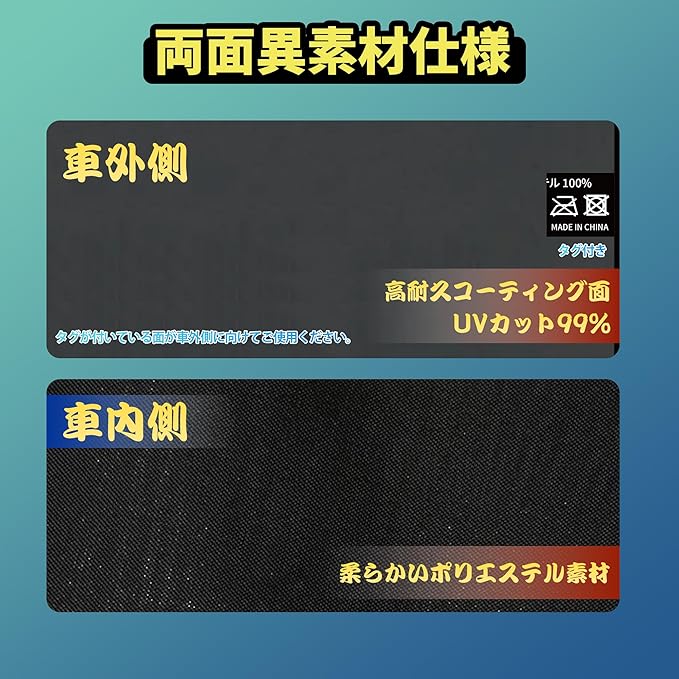 ★【両面異素材仕様】 ●車外側(外向き):高耐久コーティング面 — 紫外線や熱に強く、劣化を防ぐ耐久加工を施しています。 ●車内側(内向き):ポリエステル素材 — 柔らかく、手触りの良い快適な生地です。 ※取り付けの際は、タグが付いている高耐久コーティング面が外側(車外)を向くようにしてください。 間違った向きで装着すると、遮光や耐久性の効果が十分に発揮されない可能性がありますので、ご注意ください。