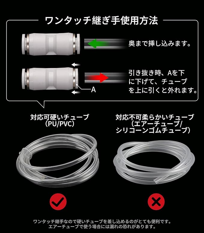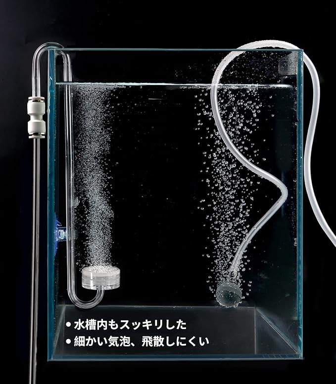 【供給源】エアポンプ専用。CO2システム不可。接続チューブは硬いチューブを使ってください。エアーチューブが柔らかいので、ワンタッチ継ぎ手の接続所からエアーが漏れる可能性があります。対応チューブ:内径4mm/外径6mm