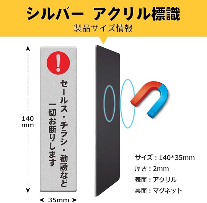 【高品質材質】サイズ:140 35mm、標識 サインは2mm厚のアクリルでUV印刷されており。裏面にマグネットが付いており、何度でも貼り直すことができます。商品が届いたらすぐに簡単に取り付けることができます。