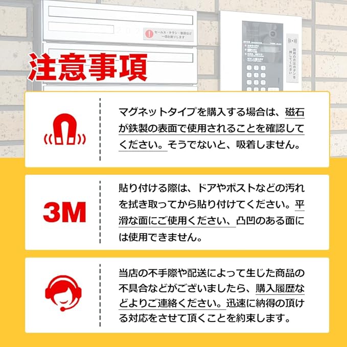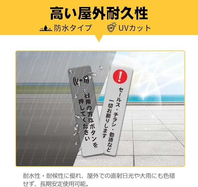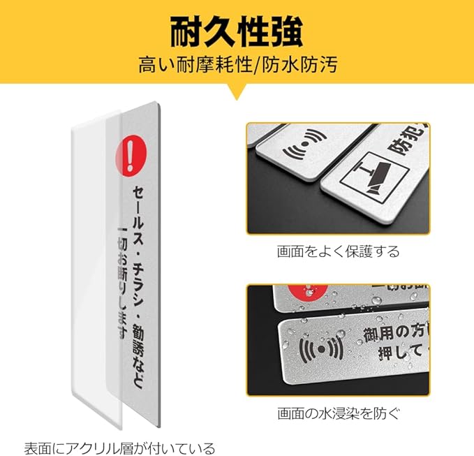 【セールス・チラシ・勧誘お断り】このお断りプレートは、玄関前や宅配ボックスに貼り付けることで、不要なセールス、勧誘、チラシの配布を阻止するための明確かつ直接的なメッセージを掲示しています。ストレスフリーな生活をサポートします。