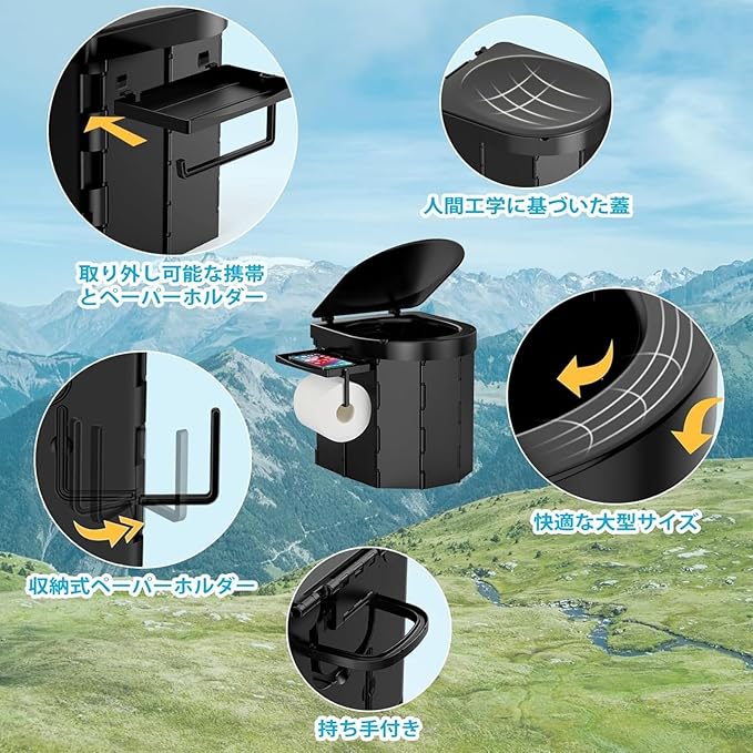 【人間化されたデザイン】忘れて恥ずかしいことを防ぐためのトイレットペーパーフックと、コミュニケーションとエンターテイメントを維持するための携帯電話の配置エリアが装備されています。丸ごと洗えるので清潔に保て、緊急時のニーズにも対応します。屋外でのトイレをより安全かつ便利にする、細部にまで配慮したポータブルトイレです。