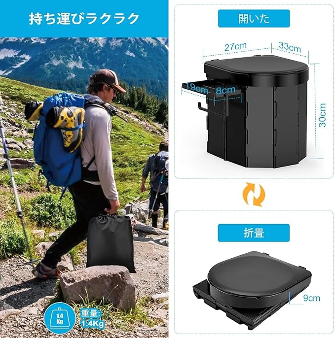 【幅広い用途、一台で多用途】ポータブルトイレとしての使用以外にも、ゴミ箱、収納ボックス、小さなスツールなどとしても使用できます。屋外や渋滞時、船舶など公衆トイレのない場所でも活躍し、ユーザーの多様なニーズに応えます。