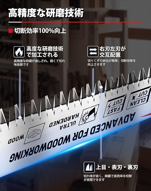 【両刃】両刃デザイン、右刃左刃が交互配置、切れ味が良く、綺麗で高効率な切断が実現できます。