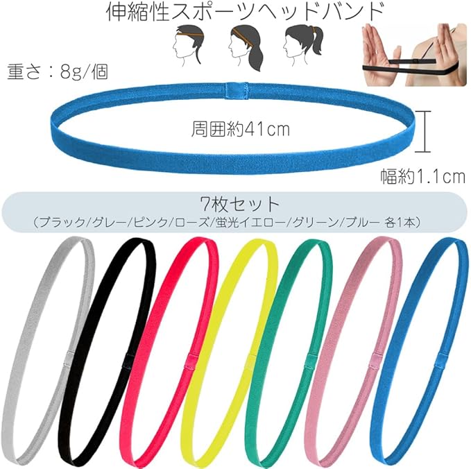 セット内容:伸縮性スポーツヘッドバンド7個セット(ブラック/グレー/ピンク/ローズ/蛍光イエロー/グリーン/ブルー 各1本)サイズ:幅約1.1cm、周囲約41cm 重さ:8g/個 商品素材:ポリエステル 適用:男女兼用
