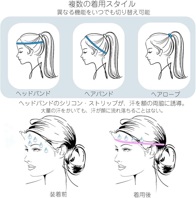 複数の着用スタイル、異なる機能をいつでも切り替え可能。汗が目に入らないようにします。ヘッドバンドのシリコン・ストリップが、汗を額の両脇に誘導。大量の汗をかいても、汗が顔に流れ落ちることはない。