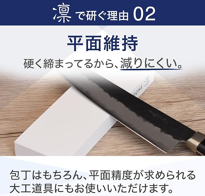 【名倉砥石付き】純粋な砥汁を作る、本体と同じ粒度/同じ材質の名倉砥石。【滑り止めマット付き】キッチン回りでもすぐに包丁を研ぐことができるよう、滑り止めマットが付属しています。滑りを防ぐゴムは、数十種類の中からキッチンのステンレスに合う厳選したものを使用しており、簡易ながら高性能の滑り止めです。砥石台を持っていない人でもすぐに研ぎ始めることができます。【補助具付き】誰でも角度を一定に保つことができる角度補助具付き