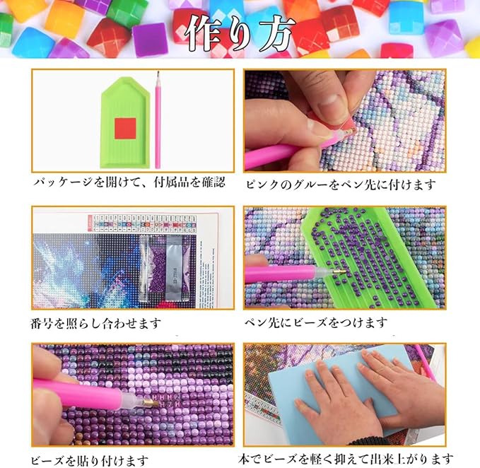 【作り方は簡単】ペン先をピンクのグルーを付けて台紙にビーズと同じ記号または英数字を貼り付けるだけでキラキラなダイヤモンドアートが仕上がります。クロスステッチ刺しゅうより気軽になり、集中力がUP、達成感もじゅうぶん味わっていただけます。