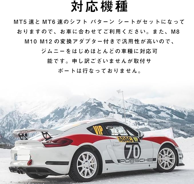 取付簡単: シフトノブは特別な道具なしで取り付け可能なねじ込み式で、MT5速とMT6速のシフトパターンシートがセットになっています。シフトノブはM8、M10、M12の変換アダプターも付属し、汎用性が高く、ほとんどの車種に対応可能です。