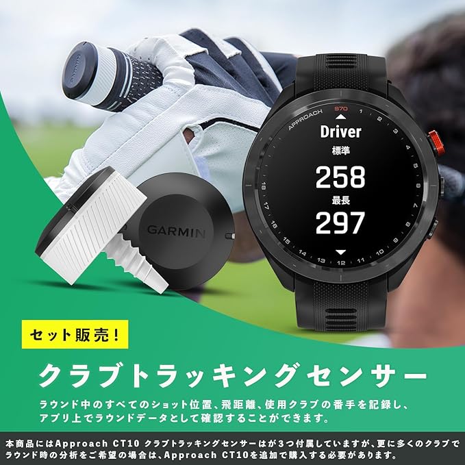 【キャンペーン品】本商品は、Approach S70 47mm BlackとApproach CT10 クラブトラッキングセンサー3個セットの2つの商品のバンドル商品です。【バンドルの魅力】Approach CT10をクラブに装着することで、Approach S70のオートショット機能と連動して、使用クラブによるショット位置、飛距離、番手を記録可能!