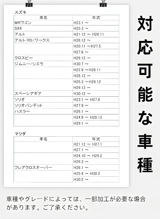 【対応可能な車種】アルト(H21.12〜)、アルトラパン(H20.11〜)、スイフト(H22.9〜)、スペーシア(H25.3〜)、ハスラー(H26.1〜)、ワゴンR、スティングレー(H24.9〜)、MRワゴン(H23.1〜)、SX4(H25.3〜)などに適用可能です。多種のスズキ車種に対応可能。ご自身の車種を確認の上、安心してご購入ください。