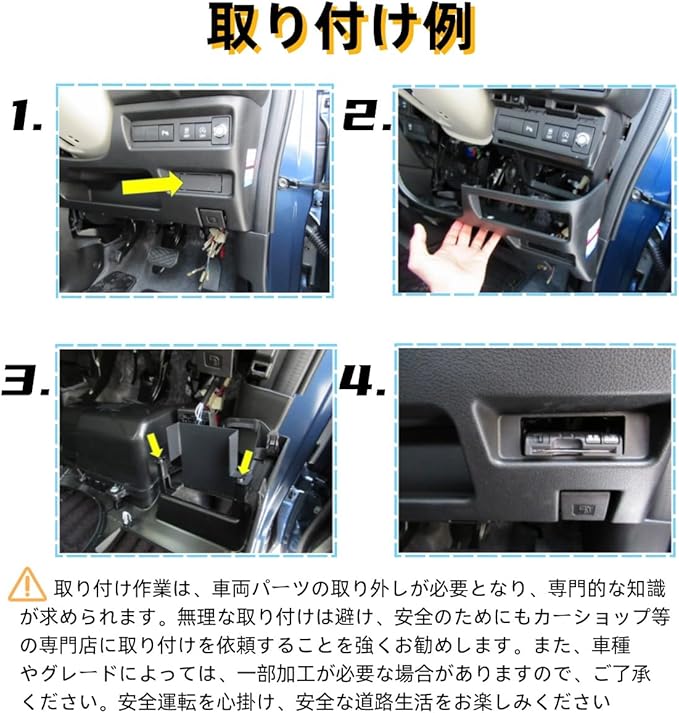 【安全にご注意ください】取り付け作業は、車両パーツの取り外しが必要となり、専門的な知識が求められます。無理な取り付けは避け、安全のためにもカーショップ等の専門店に取り付けを依頼することを強くお勧めします。また、車種やグレードによっては、一部加工が必要な場合がありますので、ご了承ください。安全運転を心掛け、安全な道路生活をお楽しみください