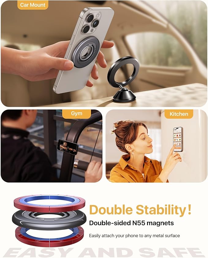 【】両面.を使用すると、このMagSafe電話グリップは、冷蔵庫、テーブル、運動器具、磁気カーマウントなど、磁気特性を持つあらゆる表面に接着できます。 ジムの仲間、調理補助、運転助手、自撮りパートナーとして活躍し、1日を通して様々なアクティビティにシームレスに適応します。