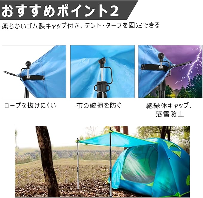 【製品仕様】2本はワンセットになります。1本の長さは約85㎝~250㎝。ポールの直径は約21mm/24mm/27mm/30mm。セット重さは約920g、1本あたりの重さ:約460g。ポールの先端は滑り止めカバー付きますので、タープやテントをしっかり固定して、抜けにくいです。