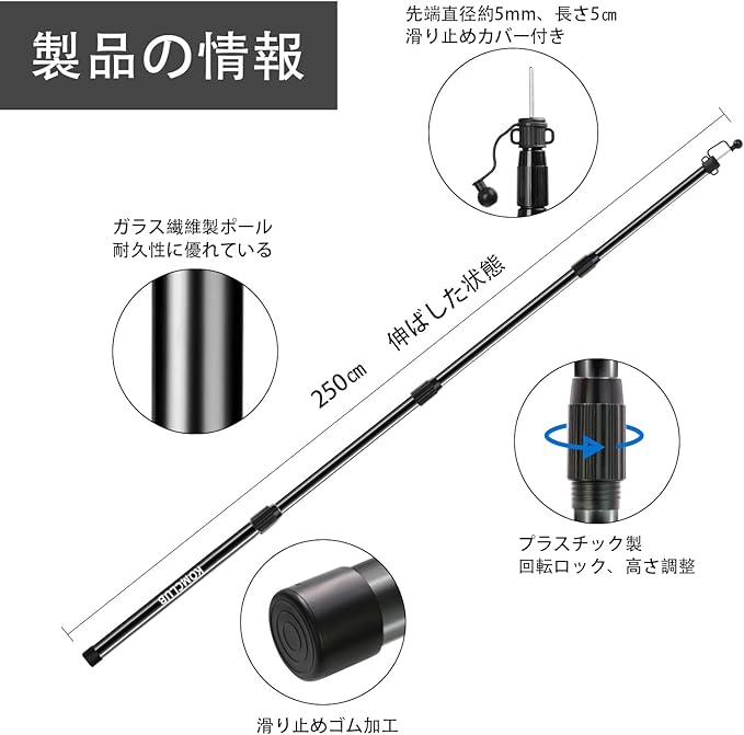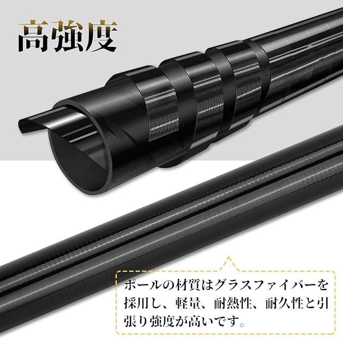 【優れている材質】ガラス繊維製材質を採用し、軽量かつ強度を持ています。耐食性や耐熱性にも優れています。ポールの最大直径は30mmなので、強い風でも折れにくくて、頑丈なポールです。