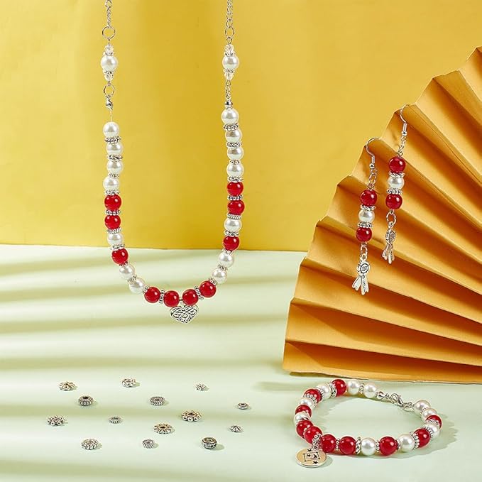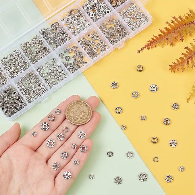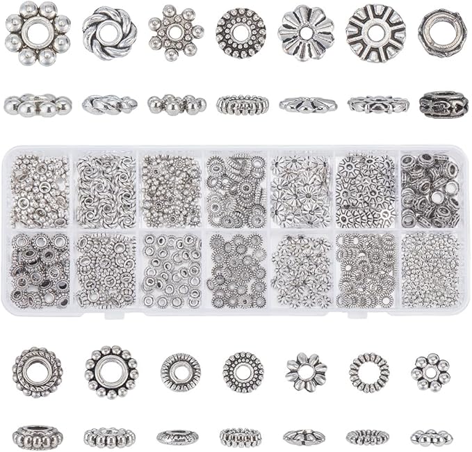 14種類のスペーサービーズ:ロンデル、花形、平らな円盤状の形状。魅力的なジュエリーを作るための選択肢を広げます。ご自分のブレスレットに一番合うビーズを選んでください。さまざまな洋服のスタイルにぴったり合います。