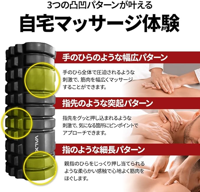 ✅3つの凸凹パターンが叶える自宅体験 ■指のような細長パターン 親指のひらをじっくり押し当てられるような柔らかい感触で心地よく筋肉をほぐします。 ■指先のような突起パターン 指先をグッと押し込まれるような刺激で、気になる箇所にピンポイントでアプローチできます。 ■手のひらのような幅広パターン 手のひら全体で圧迫されるような刺激で筋肉を幅広くすることができます。