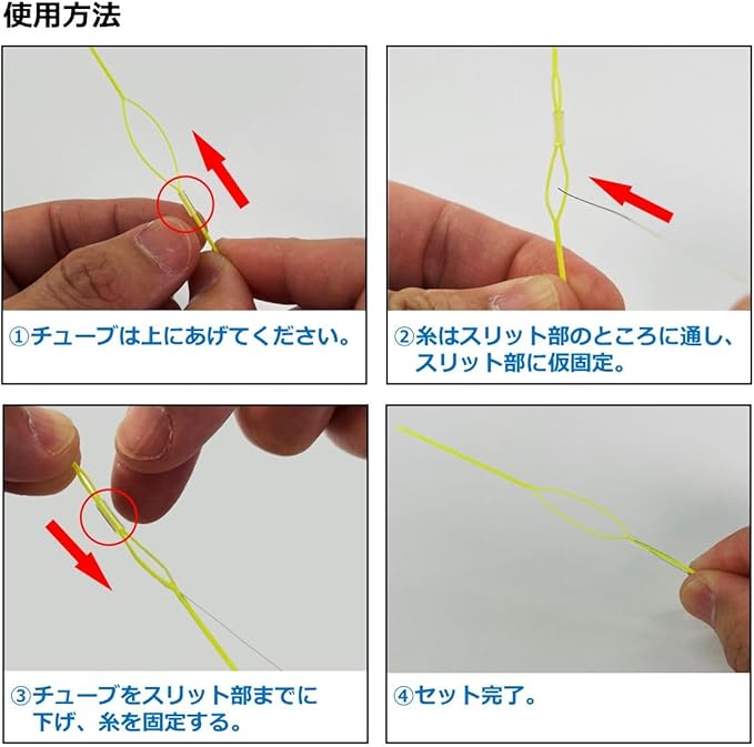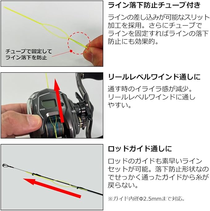 ラインの差し込みが可能なスリット加工を採用、さらにチューブでラインを固定すればラインの落下防止にも効果的