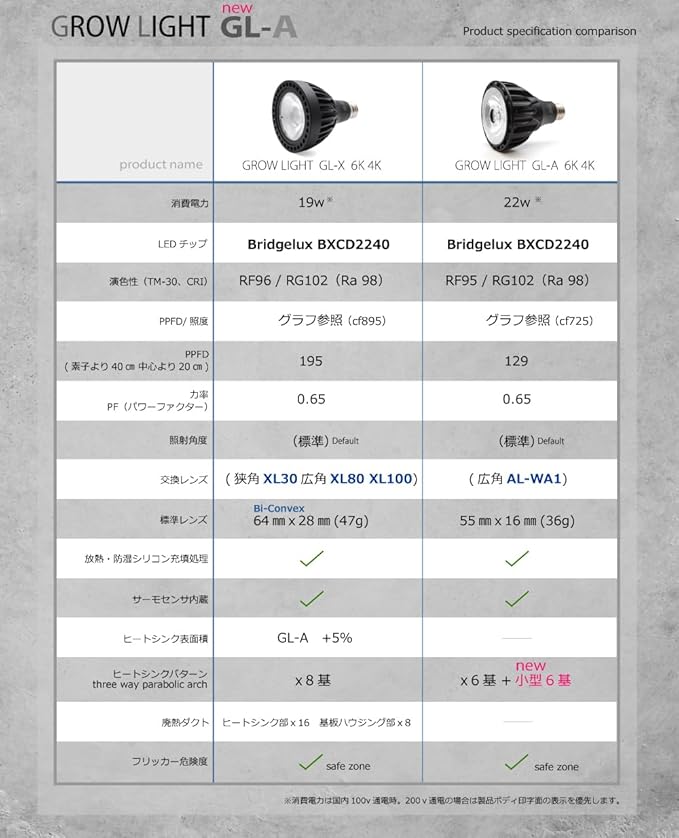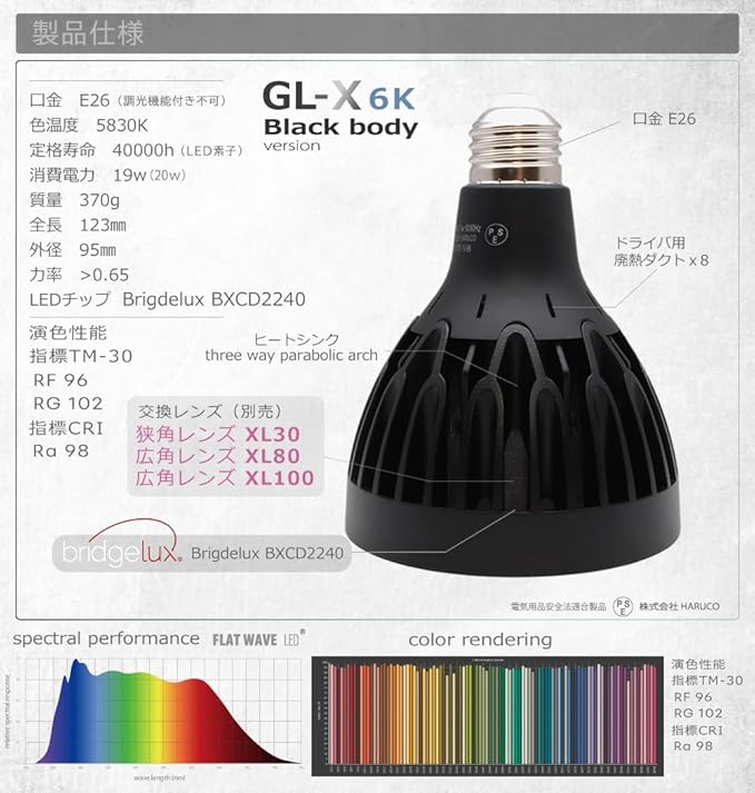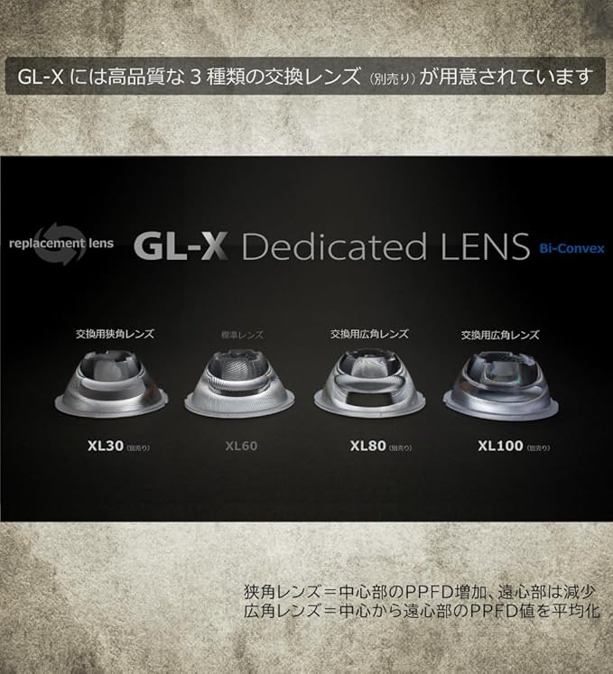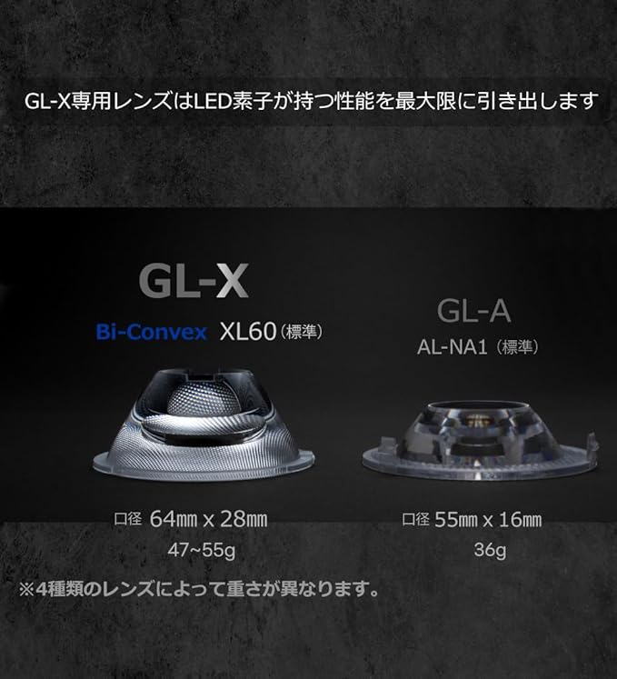 GL-Aの上位モデルGL-X(ブラックボディバージョン)は従来品同様、大型肉厚レンズと専用電子回路を備え全体的な製品仕様が向上しています。