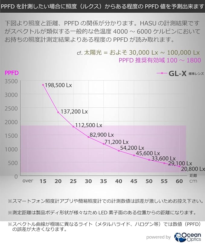 植物育成を想定した高密度フルスペクトルLEDは各距離でのPPFD値も高く植物の光合成をサポートします。