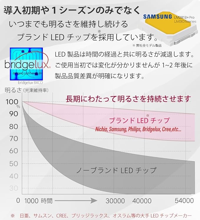 LED素子は太陽光スペクトルのように緩やかなカーブを描くフラットウェーブLEDを搭載しています。製品3年.
