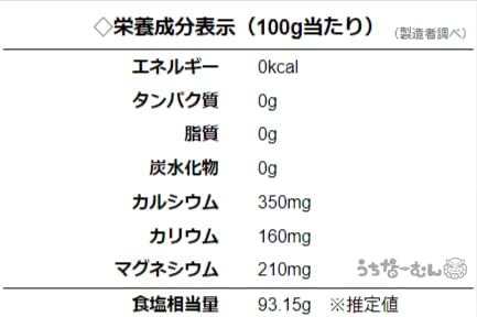 ◇栄養成分表示(100g当たり)(製造者調べ) エネルギー 0kcal タンパク質 0g 脂質 0g 炭水化物 0g カルシウム 350mg カリウム 160mg マグネシウム 210mg 食塩相当量 93.15g ※推定値
