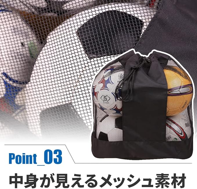 バッグ両脇にはメッシュ素材を採用しており、取りたいボールの位置がすぐに把握できます。部活・試合・家族とのレジャー時などボールを沢山持っていきたい時に重宝するアイテムです。