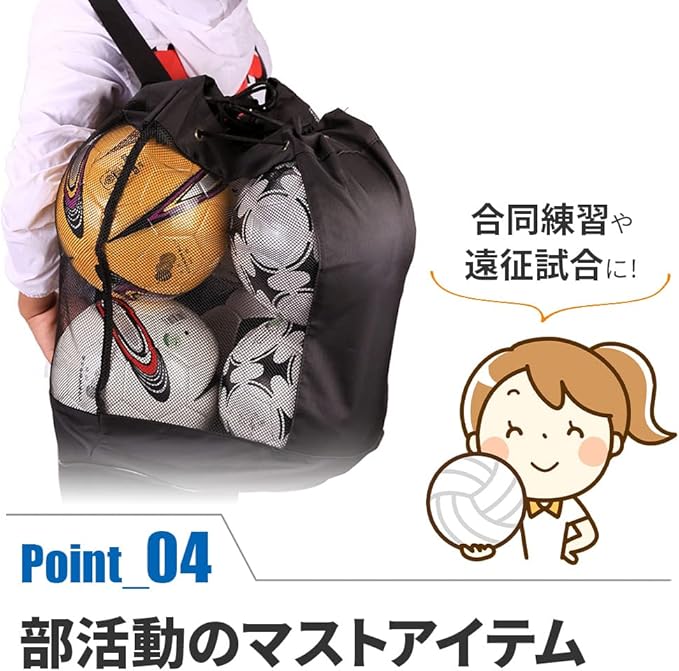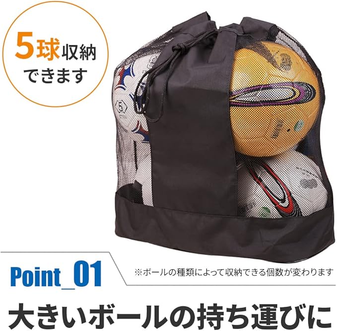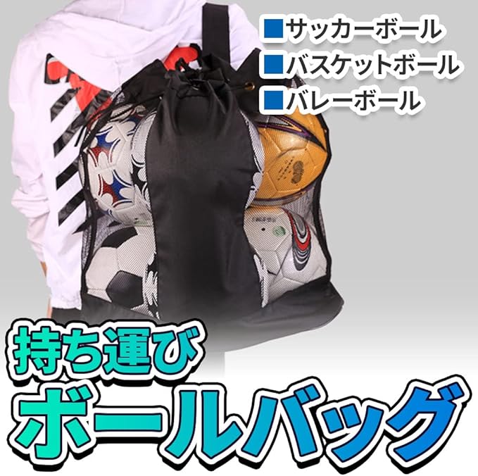 サッカー・バスケット・バレーボールなどの球技用ボールを収納できるボールバッグです。サッカーボールが約5個入る大容量設計が特徴です。
